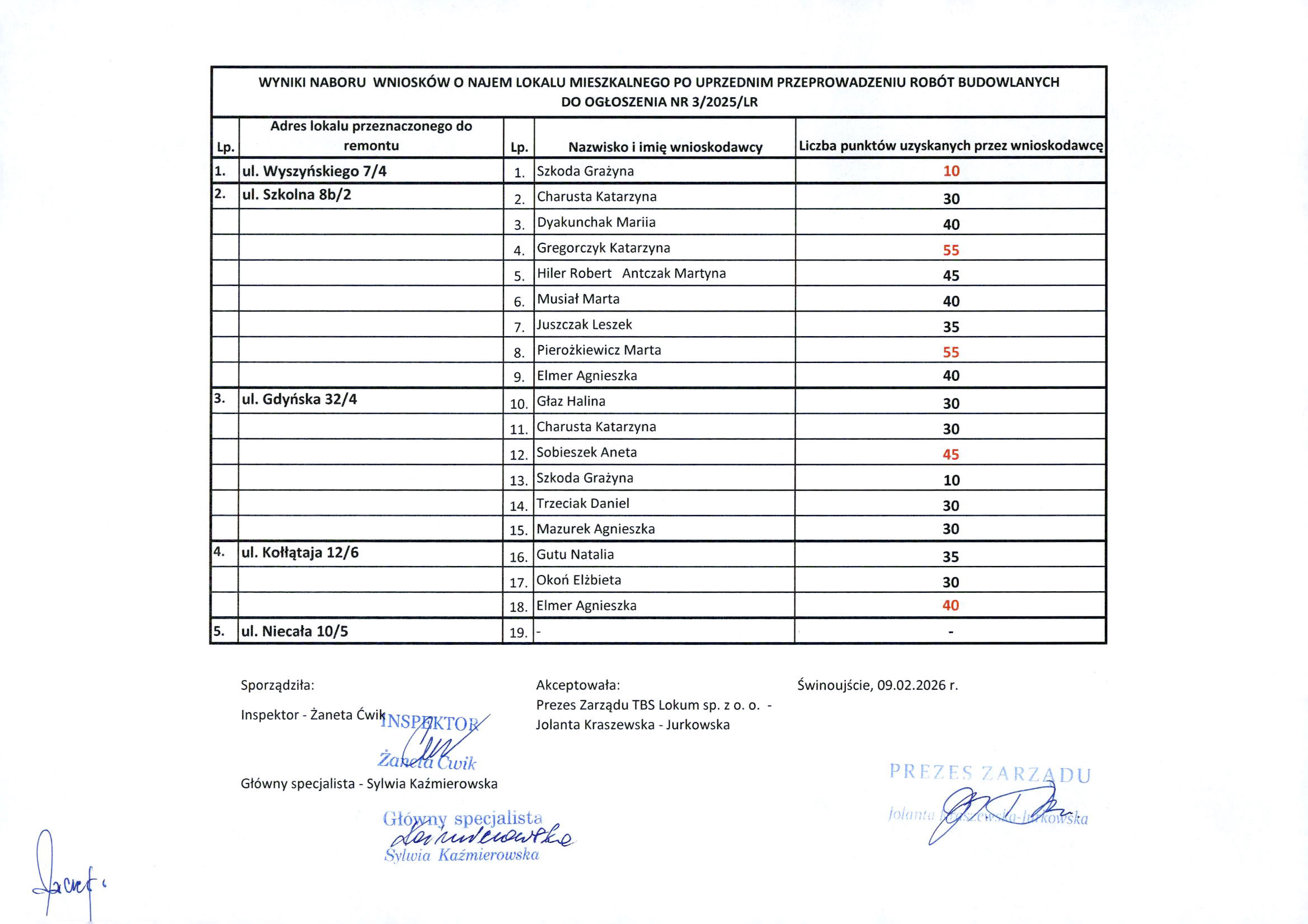Wyniki naboru wniosków o najem lokalu mieszkalnego po uprzednim przeprowadzeniu robót budowlanych do ogłoszenia nr 3/2025/LR